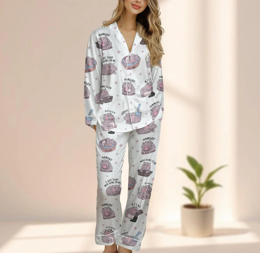 Moo Deng Satin Pajama Set, Hangry Hippo Club Sleepwear, Cute Animal Cartoon Pjs, Funny Cozy Matching Pj Set, Birthday Gift For Her