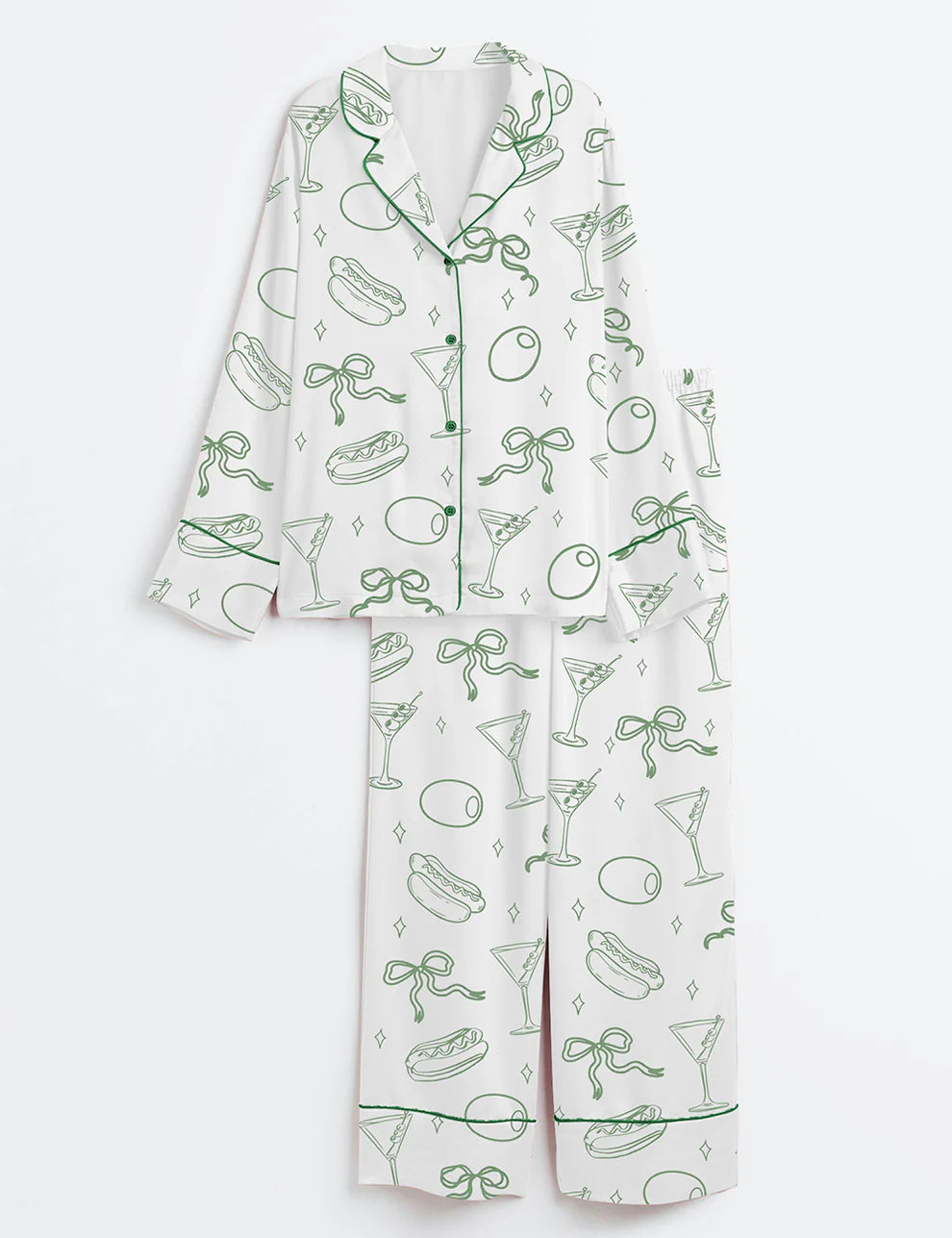 Women’s Dachshund Weenies And Tinis Bachelorette Or Birthday Hot Dogs And Martinis Print Long Sleeve Satin Pajama Set
