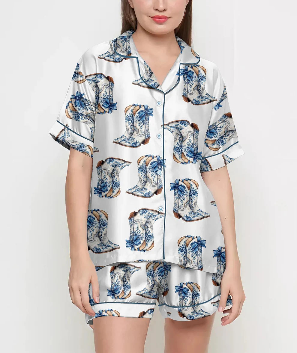 Cowboy Boots Coquette Pajamas Satin Set, Western Girl Shirt,Mother's Day Gift, Birthday Gift, Pjs For Women, Bridesmaid Gifts, Cowgirl Shirt