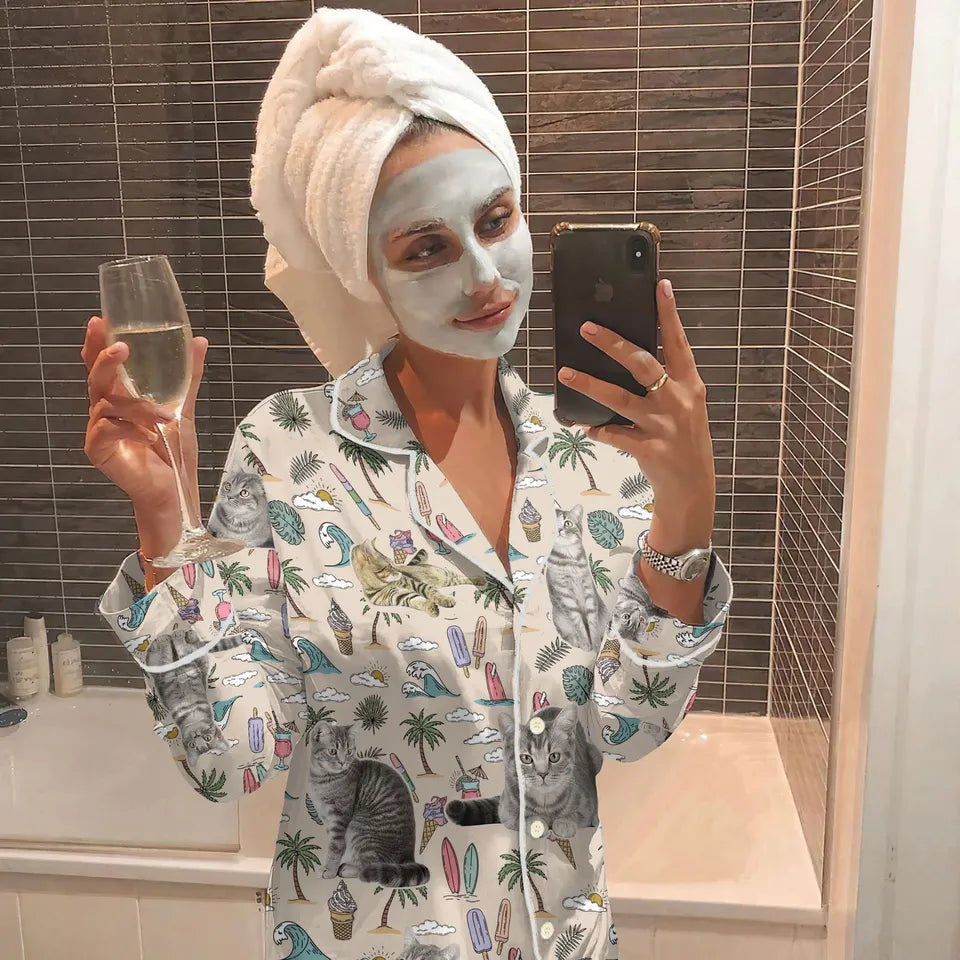 Cute Animal Hawaiian Pajamas Cat Mom Aloha Pjs Set for Women, Couple Pajamas, Cat Lover Gift, Holiday Gift for Her