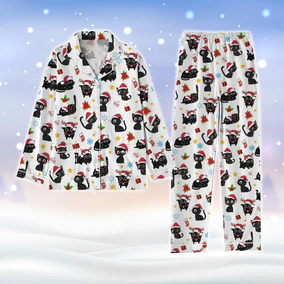 Christmas Black Cat Pajamas Set, Cat Santa Hat Holiday Pajamas, Cute Cat Xmas Pajamas, Pet Lover Pajamas, Cat Mom Shirt, Gift For Her