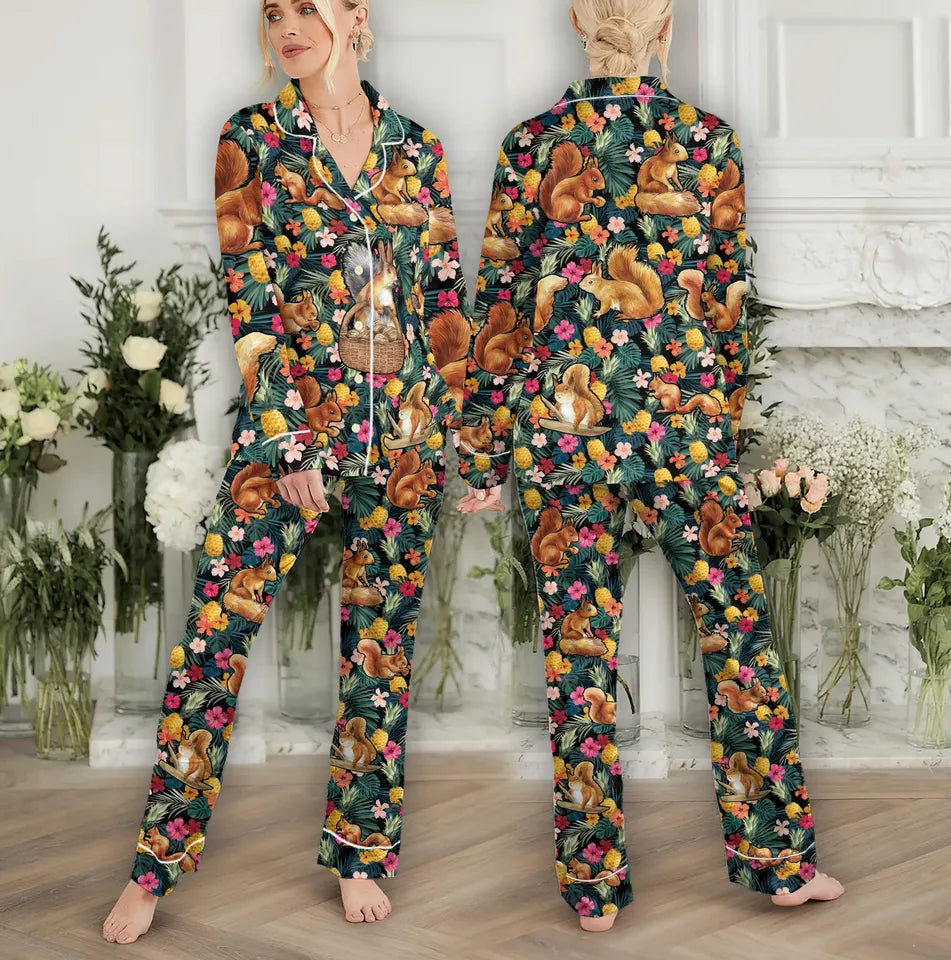 Tropical Squirrel Pajamas Animal Lover Pajama Set Family, Squirrel Whisperer Gifts for Women, Nature Hawaiian Pajamasment