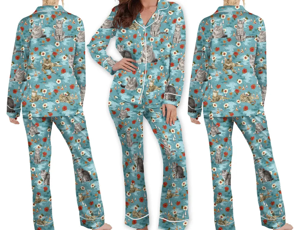 Vintage Animal Hawaiian Pajamas Funny Cat Matching Pajamas Set, Cat Lover Pjs Set for Women, Gift for Animal Lover