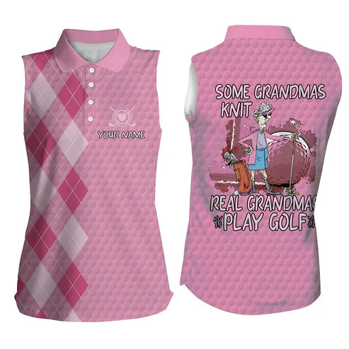 Women Sleeveless Polo Shirts Pink Argyle Pattern Some Grandmas Knit Real Grandmas Play Golf, Women Golf Shirts