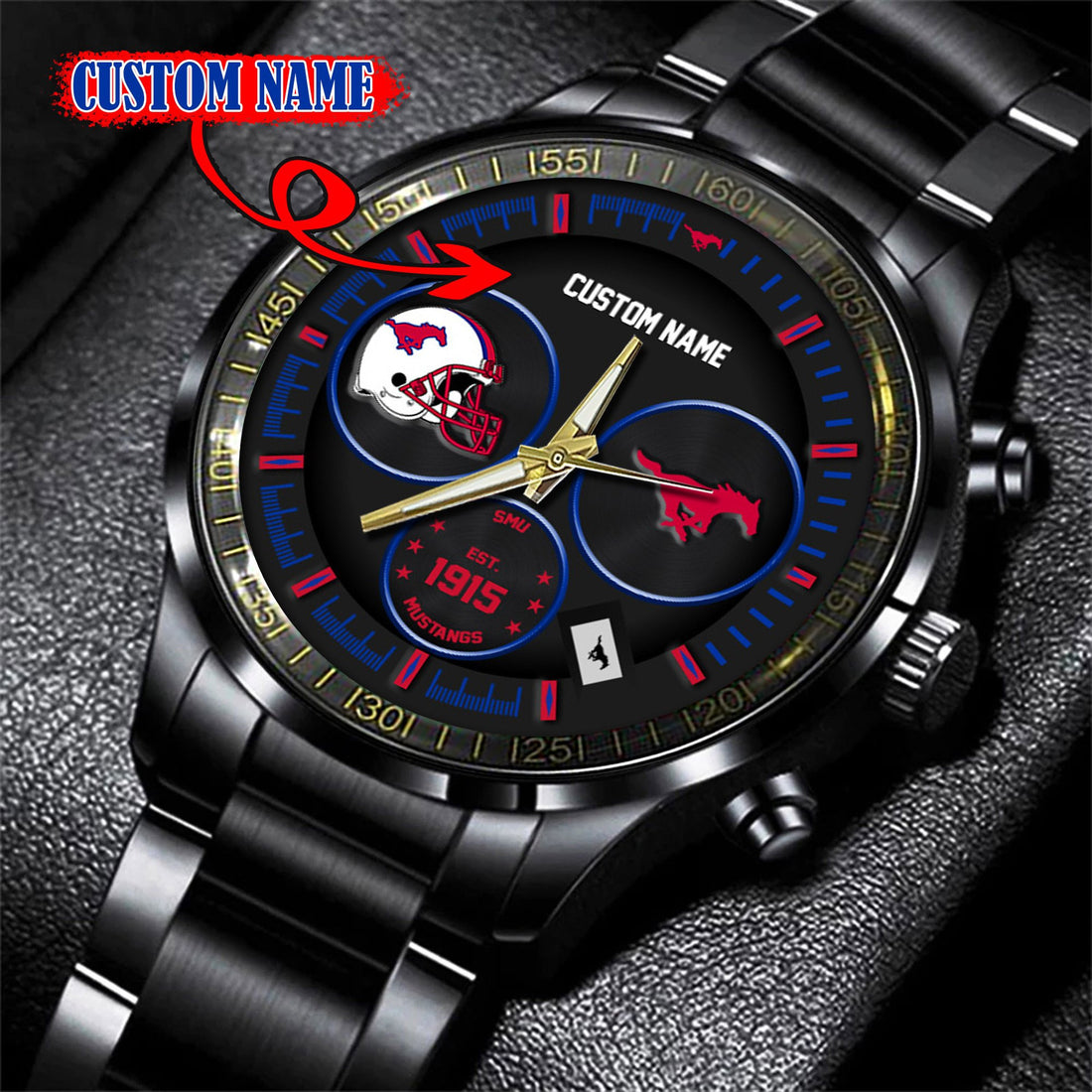 SMU Mustangs Black Stainless Steel Watch - Custom Name 58437